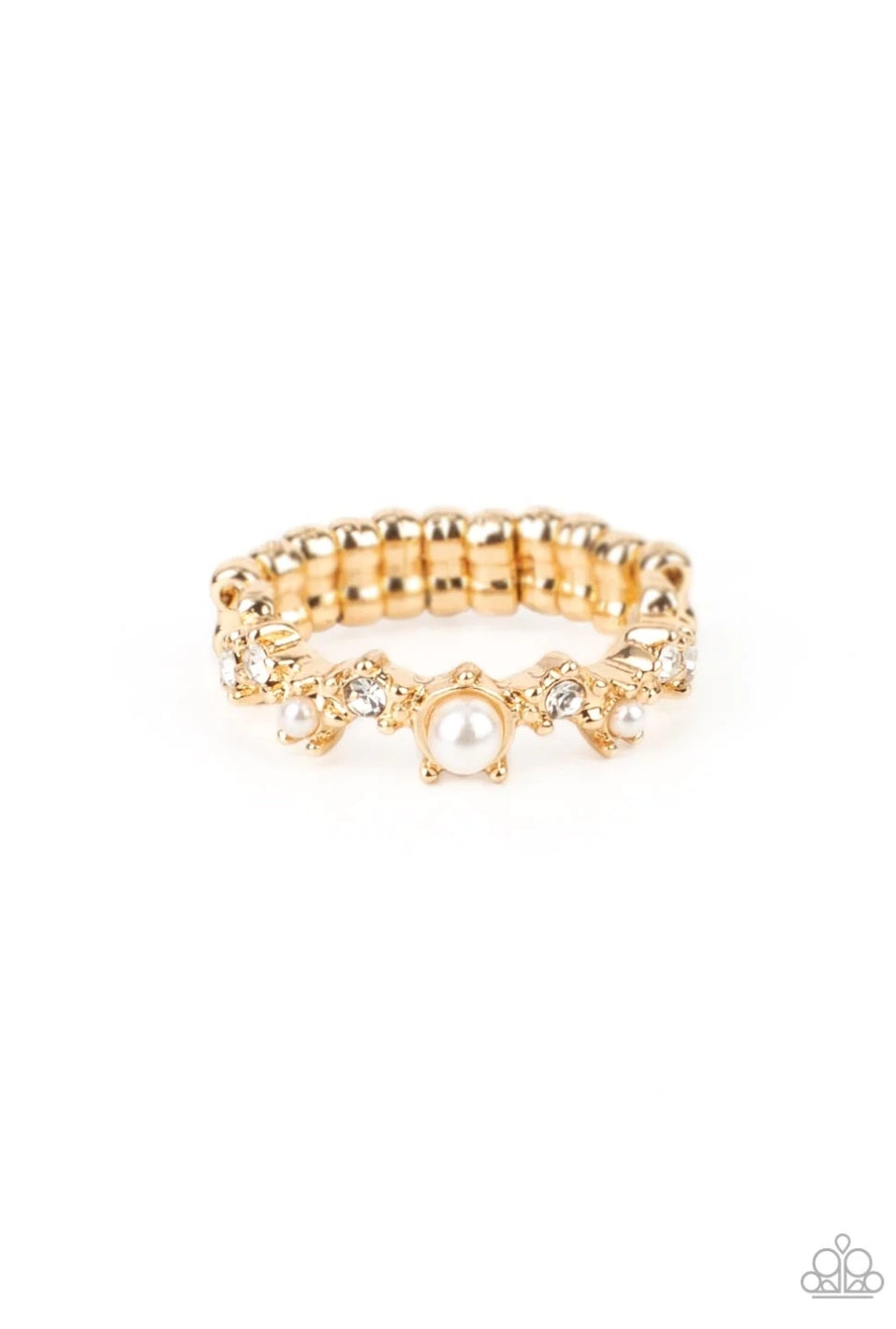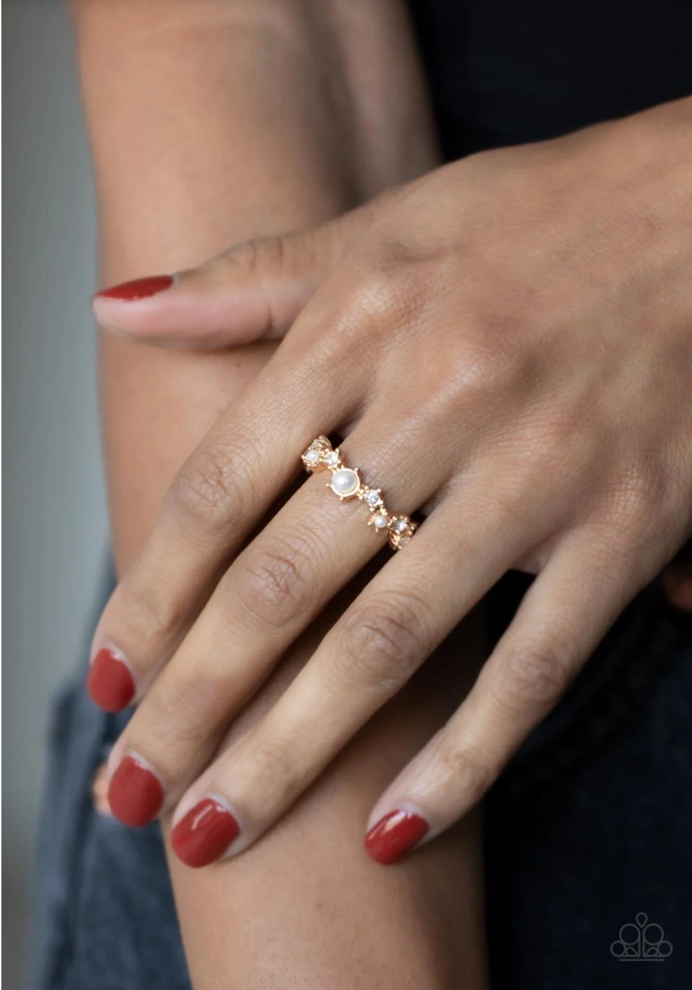 A dainty pearl bead encased in a classic gold pronged fitting is accompanied by sparkling white rhinestones and dotted pearl beads composing an exquisitely graceful fashion around the finger. Features a dainty stretchy band for a flexible fit.