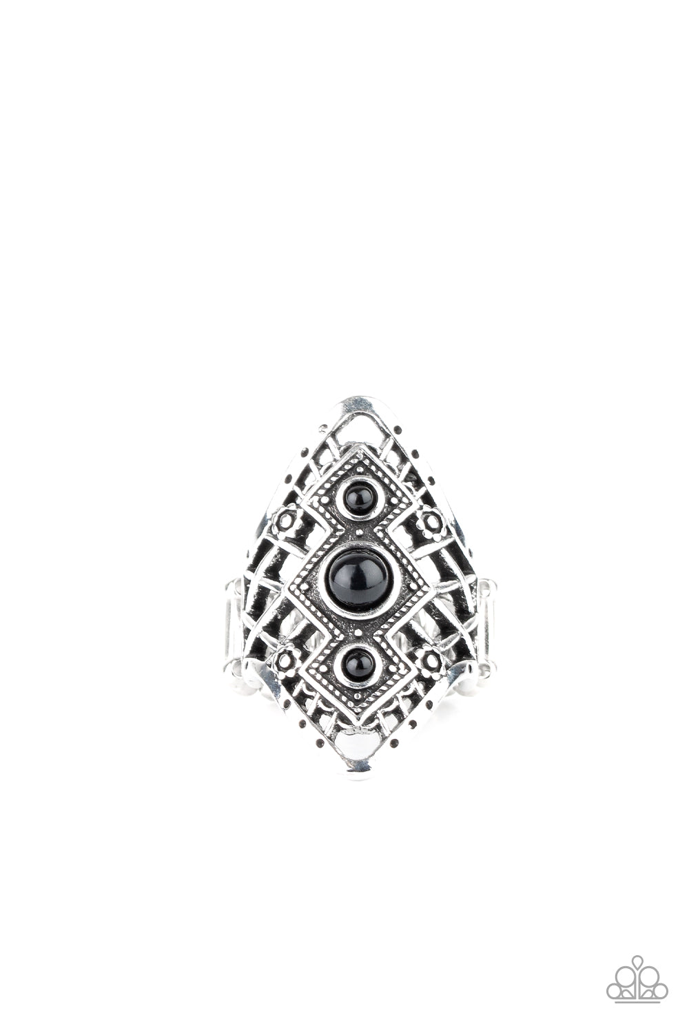 A trio of dainty black beads dot the center of an antiqued silver frame radiating with shiny floral details and an airy crisscrossed backdrop. Features a stretchy band for a flexible fit.