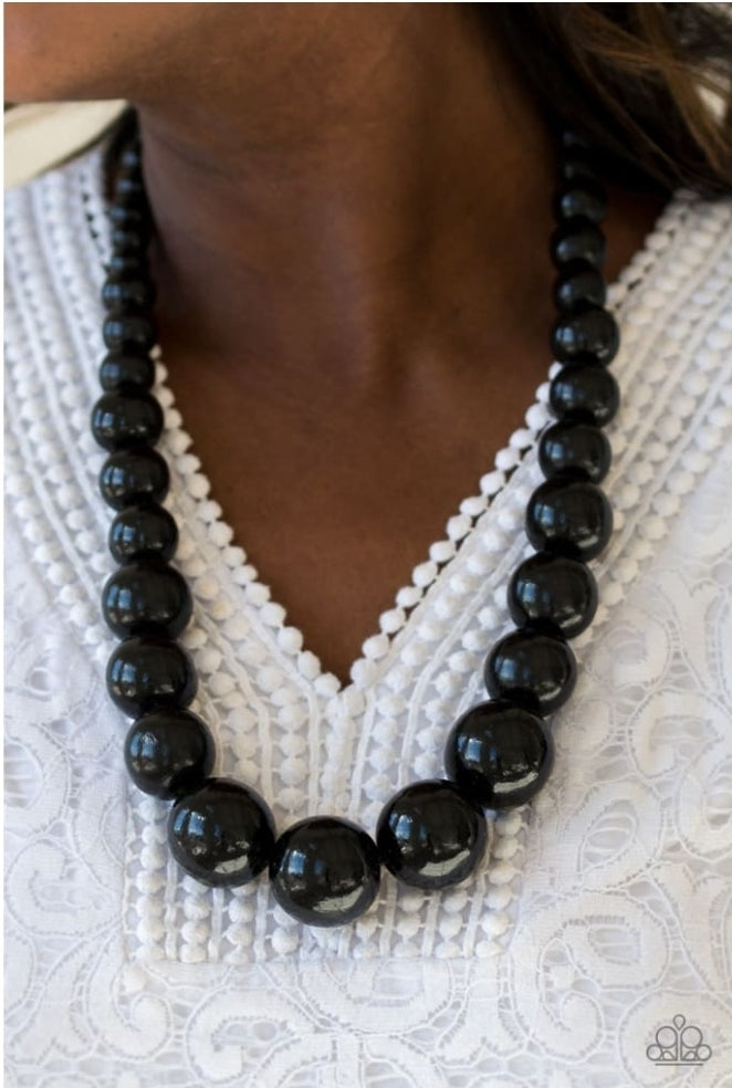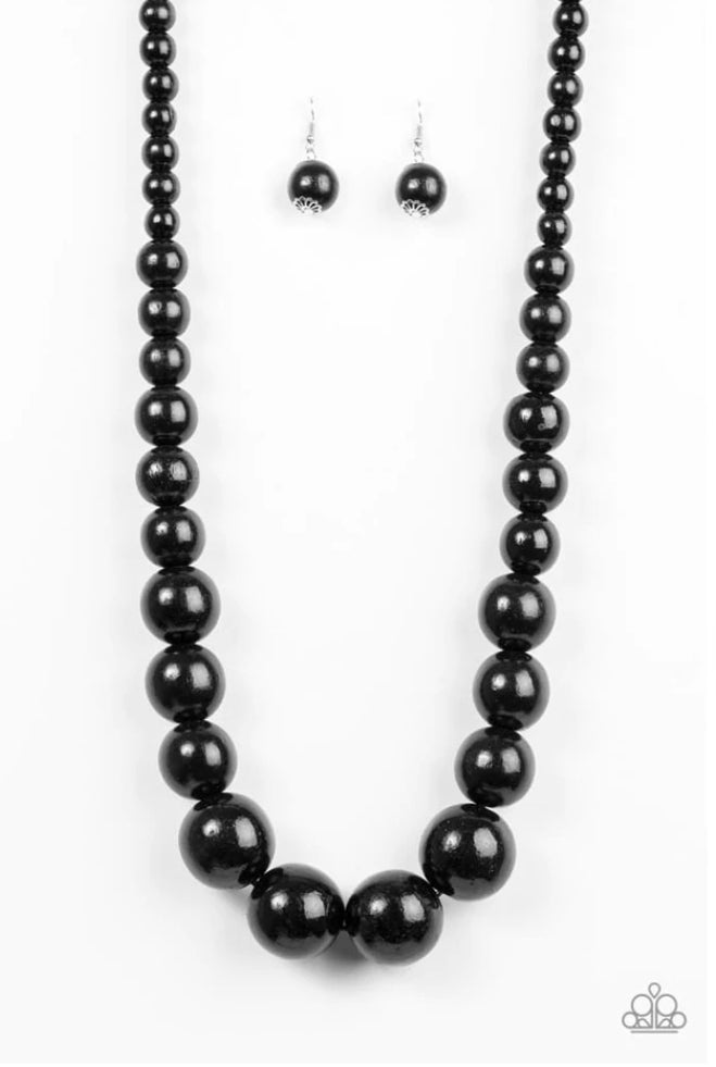 Gradually increasing in size near the center, refreshing black wooden beads are threaded along a black string for a summery look. Features an adjustable sliding knot closure.