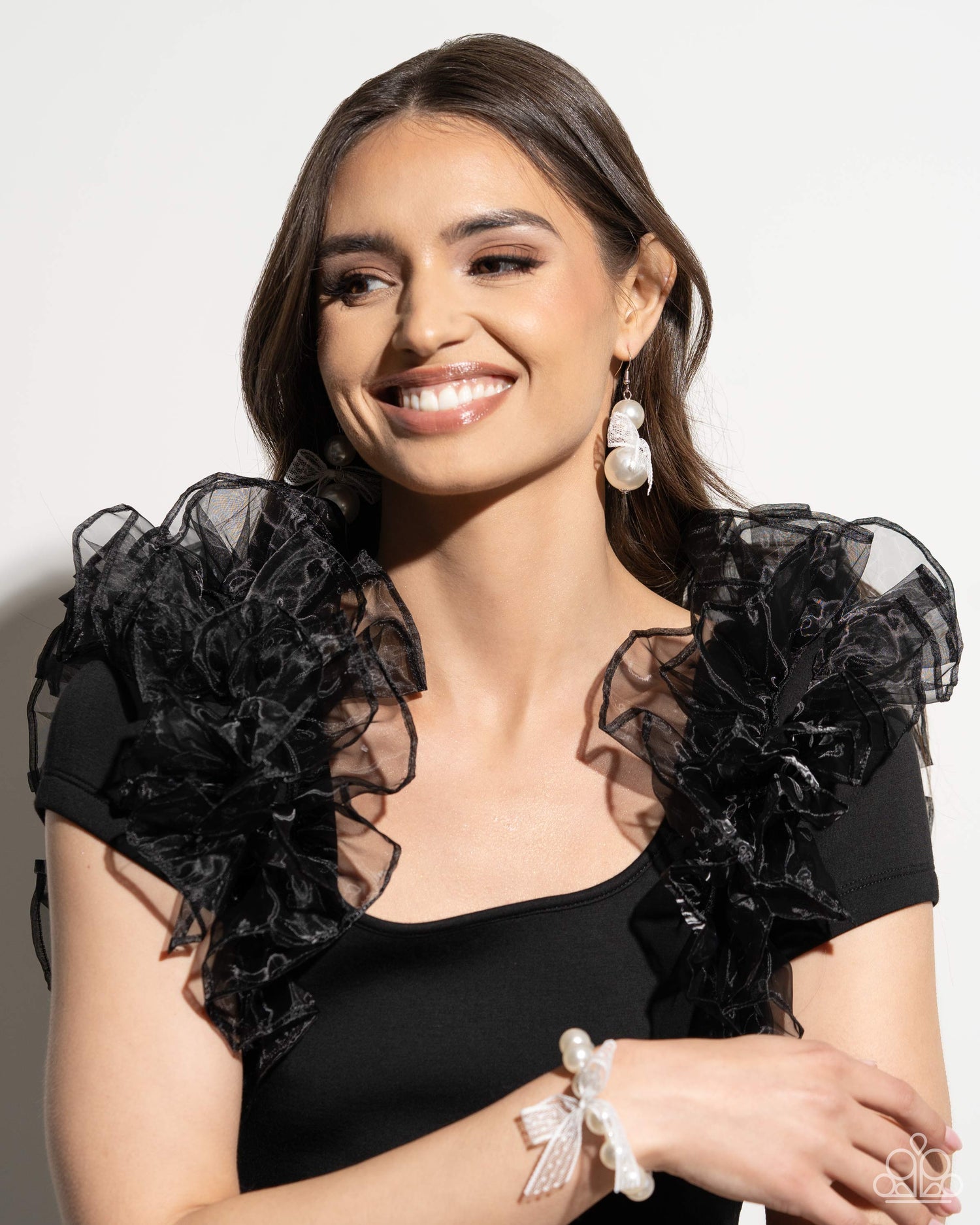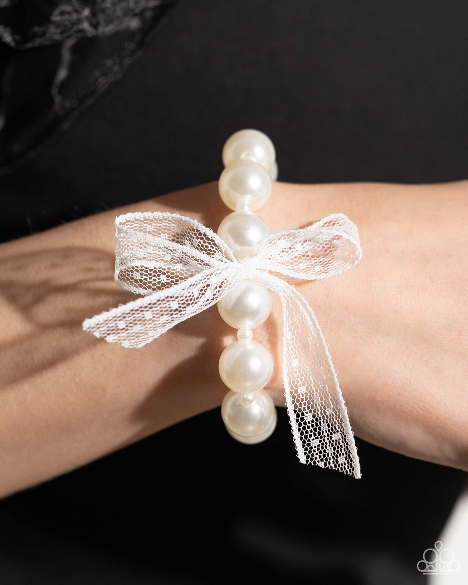 Strung along an elastic stretchy band, a collection of glossy white pearls alternate with dainty white pearls along the wrist. An airy, chiffon white ribbon is tied in the center of the pearls for a refined finish.
