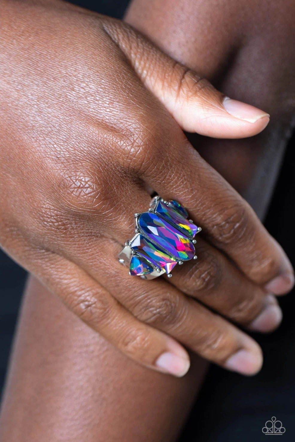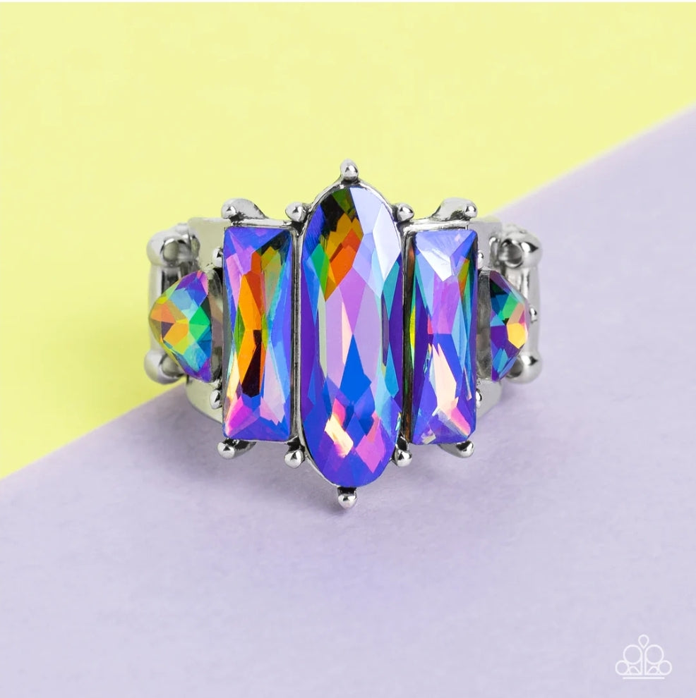 Featuring a stellar UV finish, an iridescent collection of triangular, emerald, and oval cut rhinestones are encrusted across the center of a thick silver band for an out-of-this-world fashion. Features a stretchy band for a flexible fit. Due to its prismatic palette, color may vary.