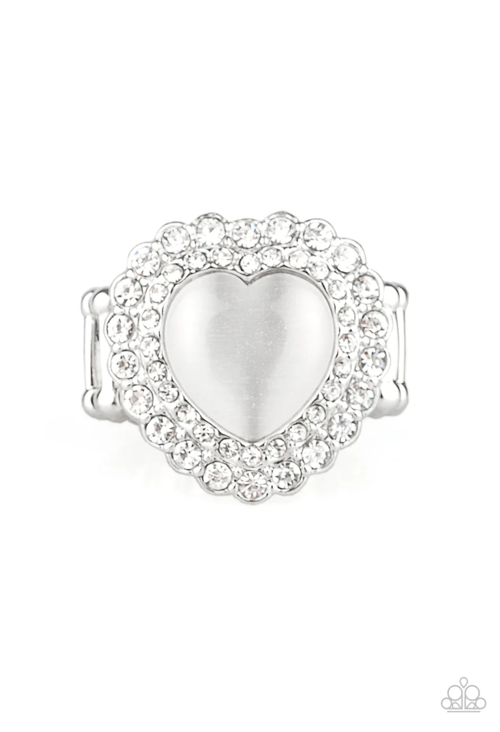 Chiseled into a charming heart shape, a glowing white cat's eye stone is pressed into the center of two silver heart frames radiating with glassy white rhinestones, creating a sparkling centerpiece atop the finger. Features a stretchy band for a flexible fit.