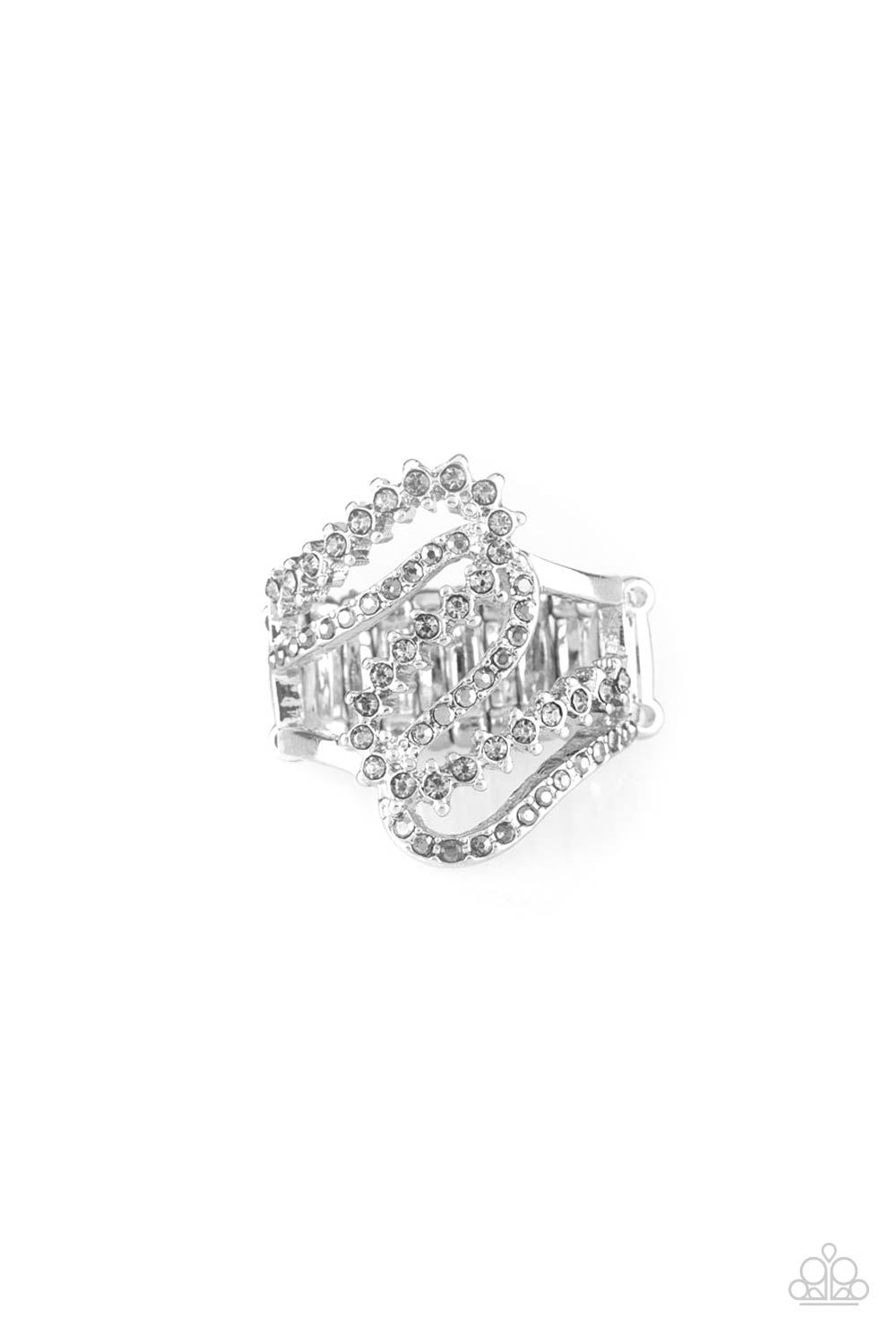 Encrusted in dainty hematite and smoky rhinestones, radiant silver ribbons wave across the finger, coalescing into a whimsical band. Features a stretchy band for a flexible fit.