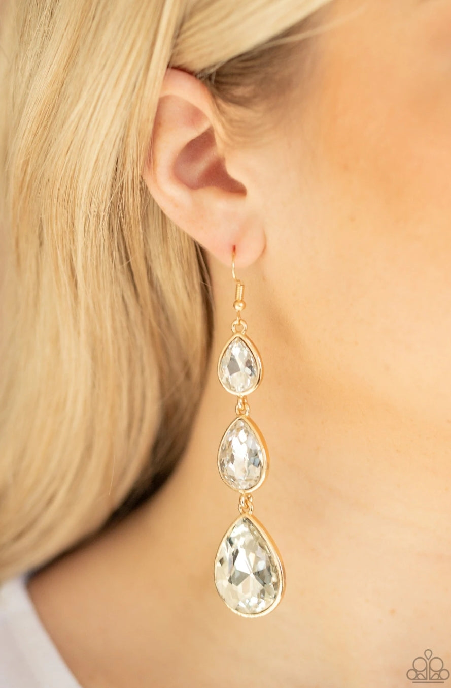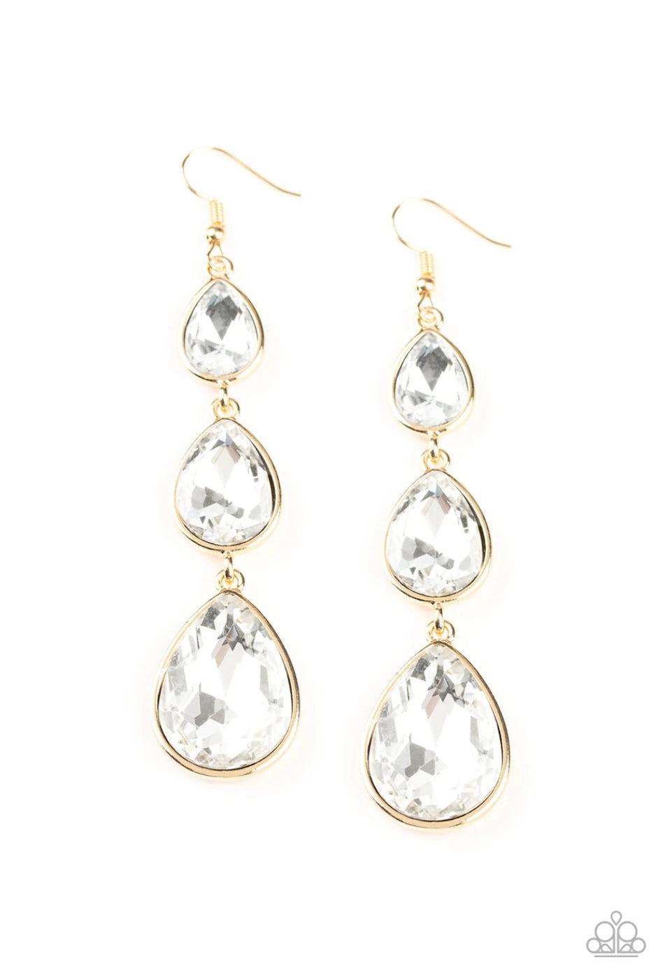 Featuring sleek gold frames, exaggerated white teardrop rhinestones gradually increase in size as they drip from the ear. Earring attaches to a standard fishhook fitting.