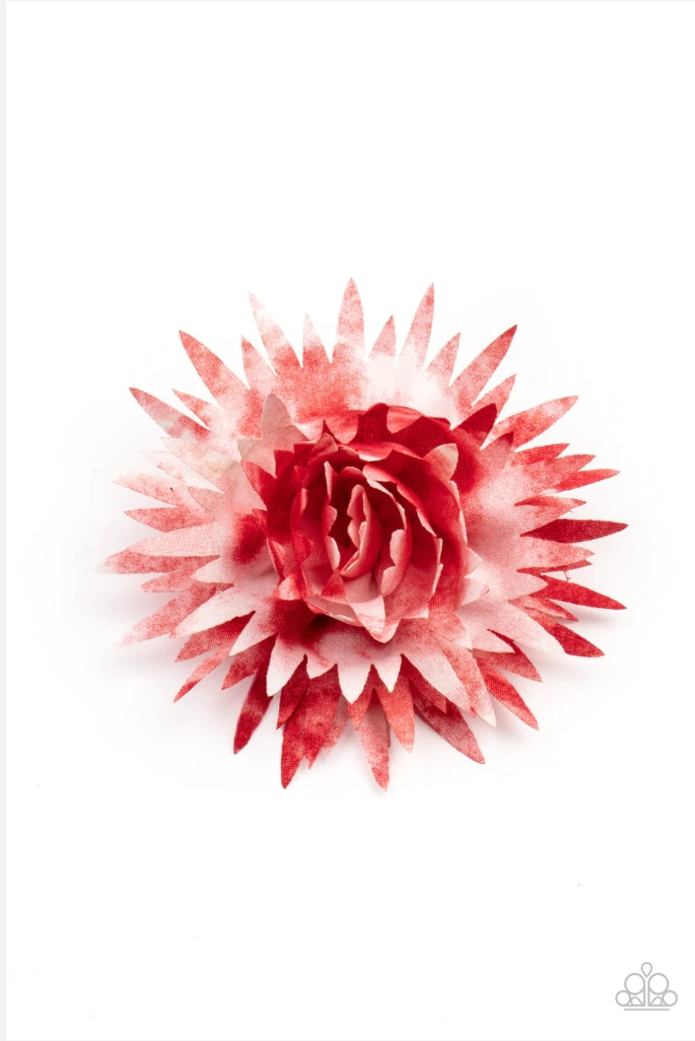Featuring red tie dye accents, boisterous petals bloom into a bouncy blossom. Features a standard hair clip on the back.