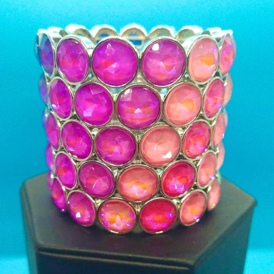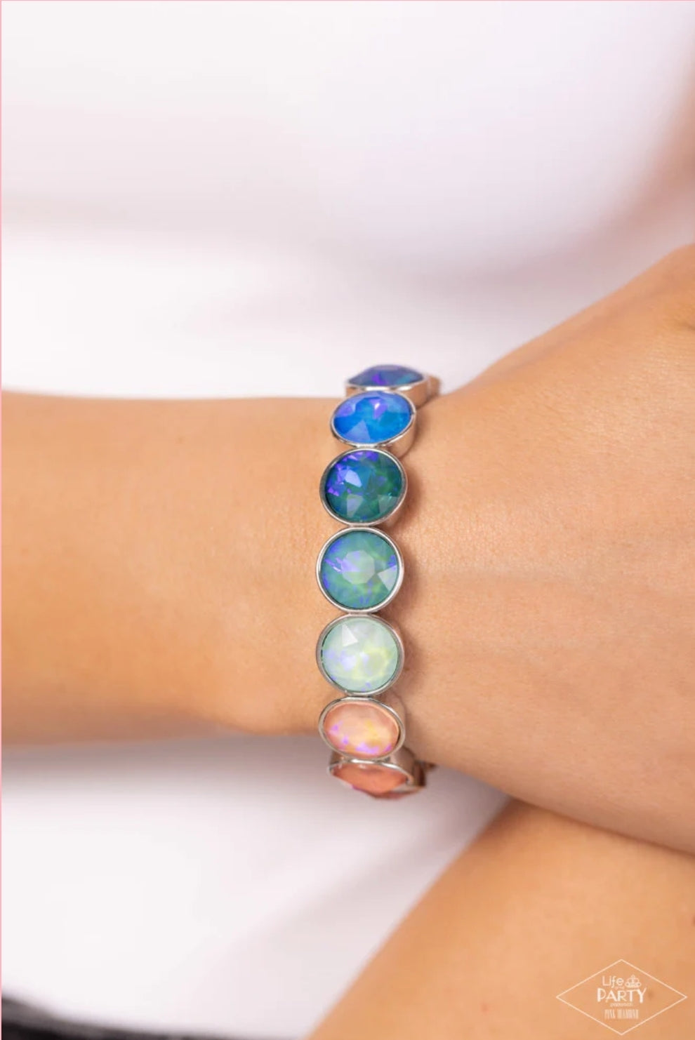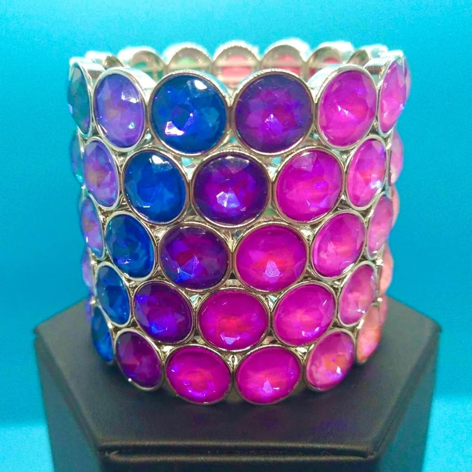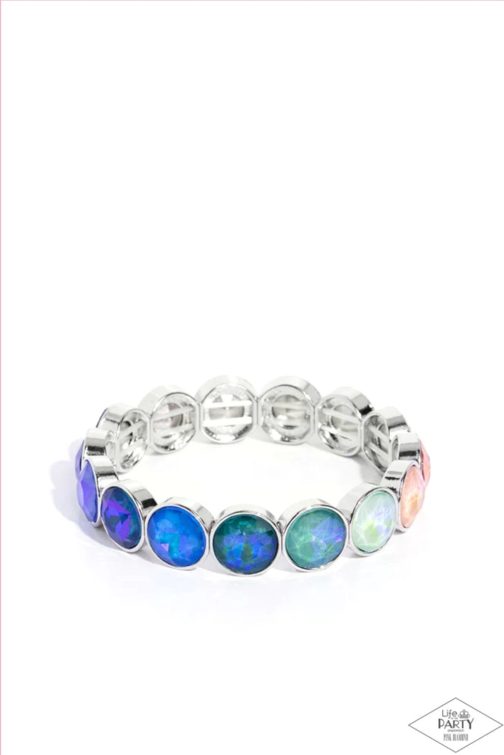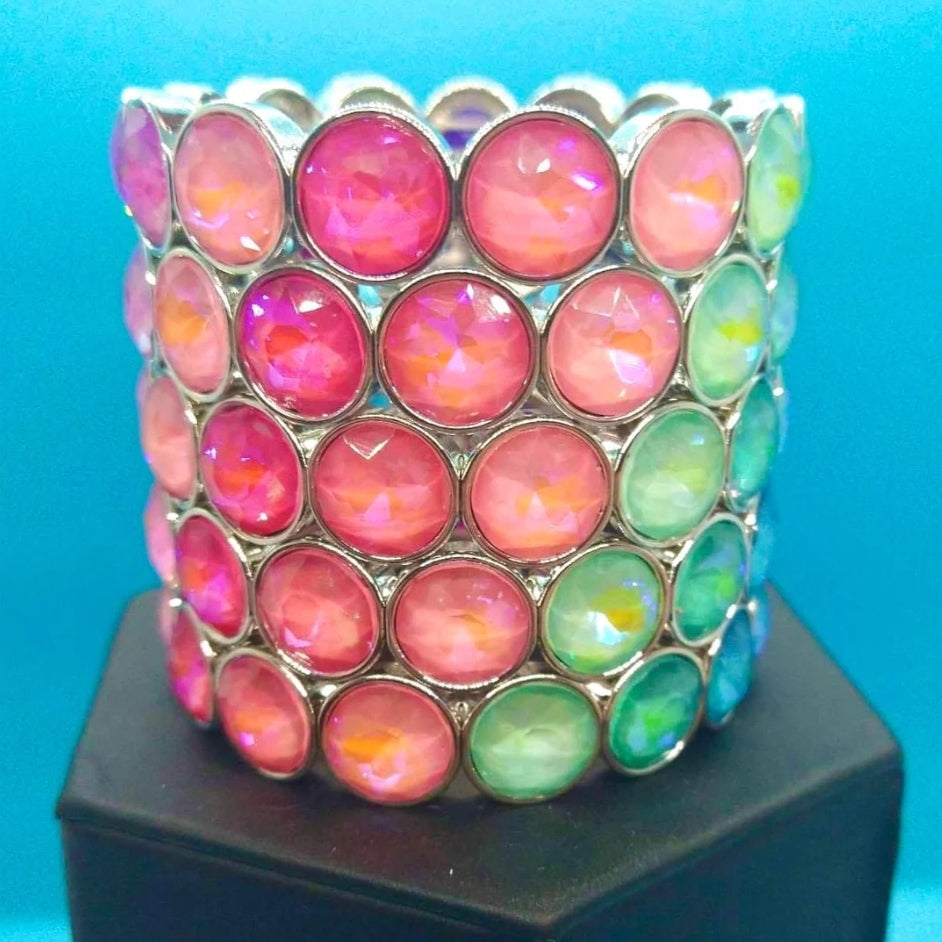 Encased in sleek silver fittings, a sparkly series of colorful opalescent rhinestones are threaded along stretchy bands around the wrist for a radiant finish. Sold as one individual bracelet.