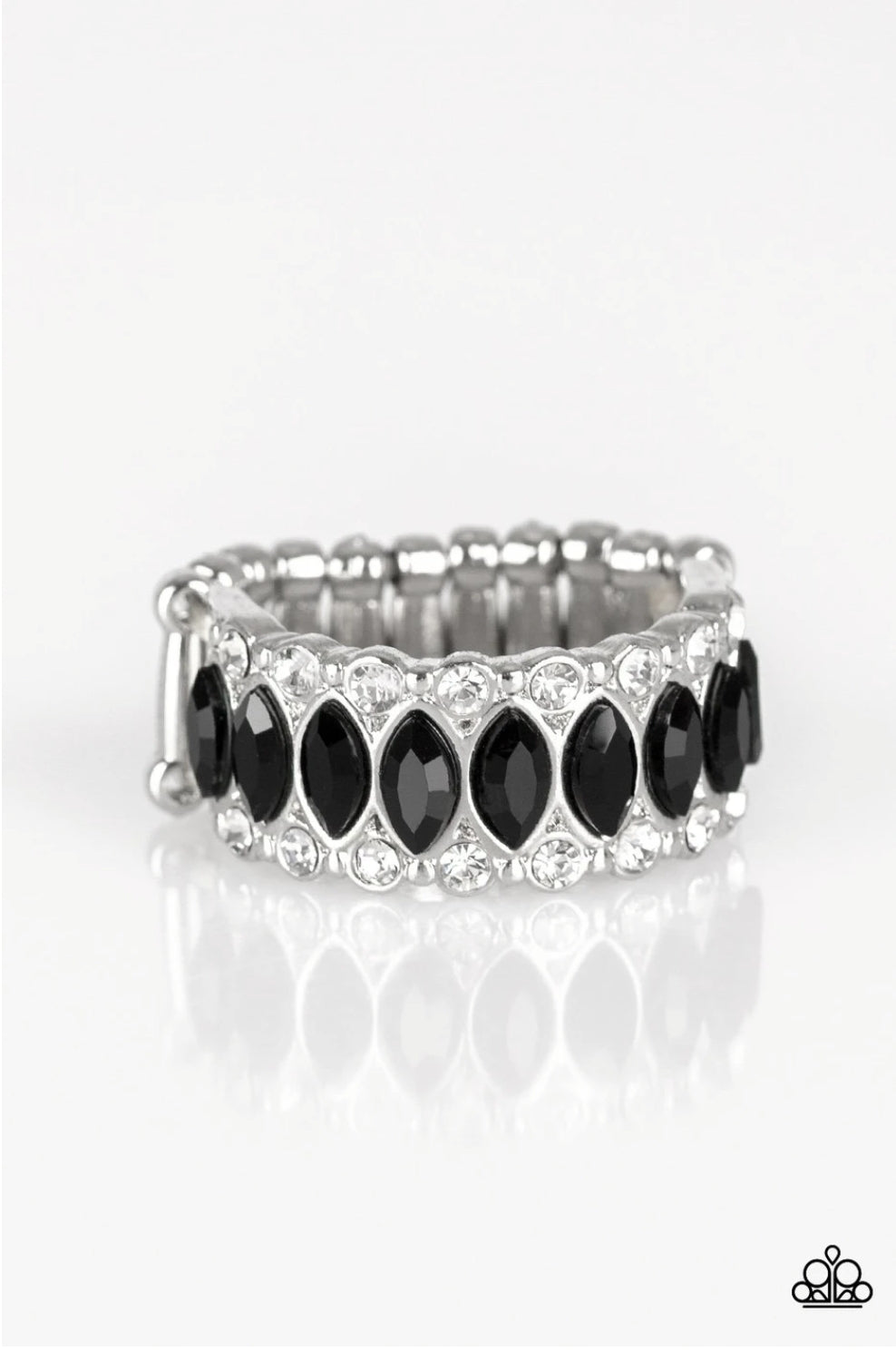 Featuring regal marquise style cuts, glittery black rhinestones are encrusted down the center of a silver band radiating with glassy white rhinestones for an edgy look. Features a stretchy band for a flexible fit.