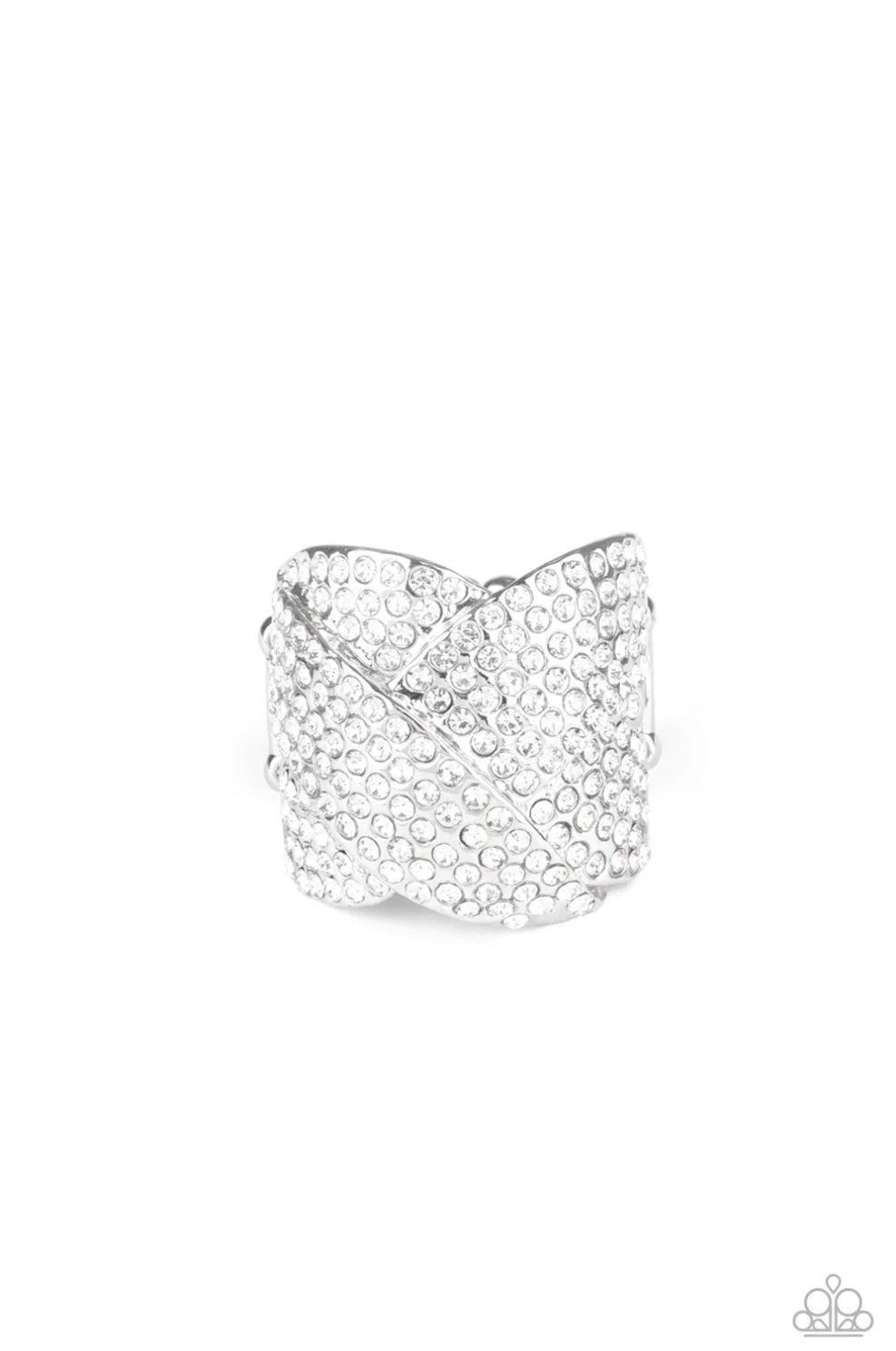 Encrusted in row after row of glittery white rhinestones, dazzling silver bands overlap atop the finger, creating a glamorously stacked frame. Features a stretchy band for a flexible fit.