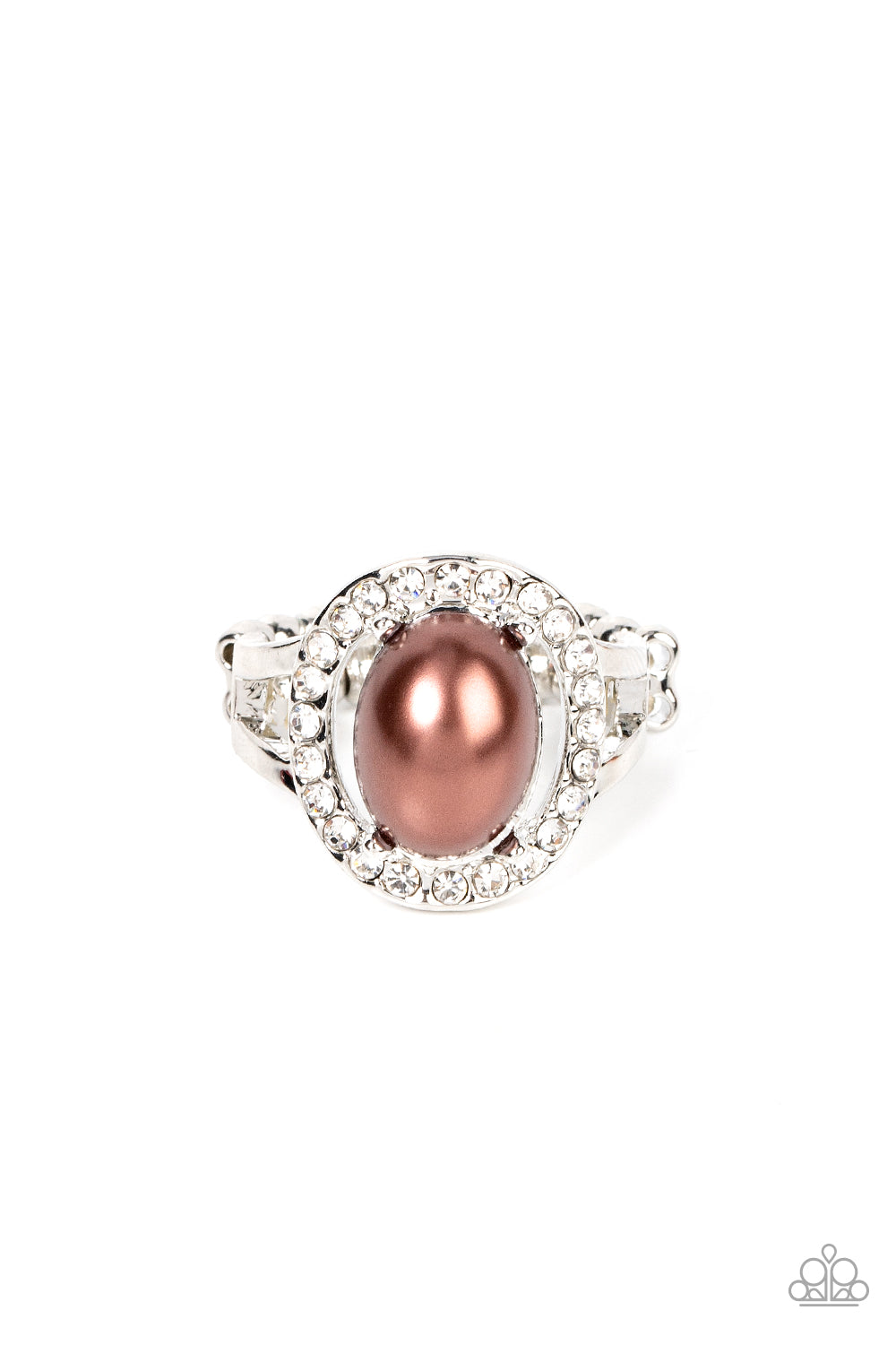 An oval brown pearl seemingly floats inside a glittery ring of white rhinestones atop layered bands of silver, resulting in a timeless centerpiece atop the finger. Features a dainty stretchy band for a flexible fit.