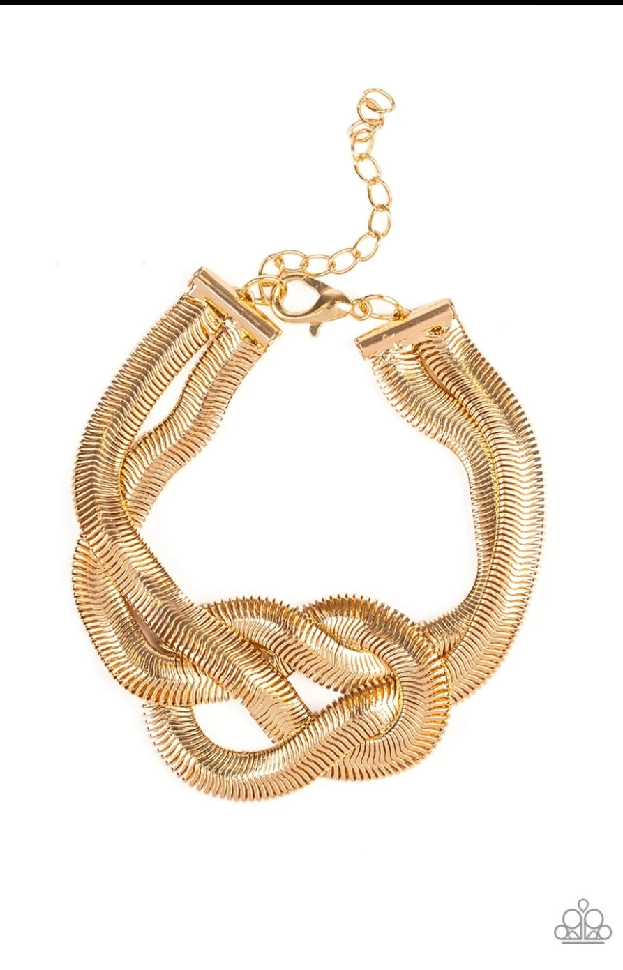 Two thick rows of gold herringbone chain knot into a bold centerpiece atop the wrist. Features an adjustable clasp closure.